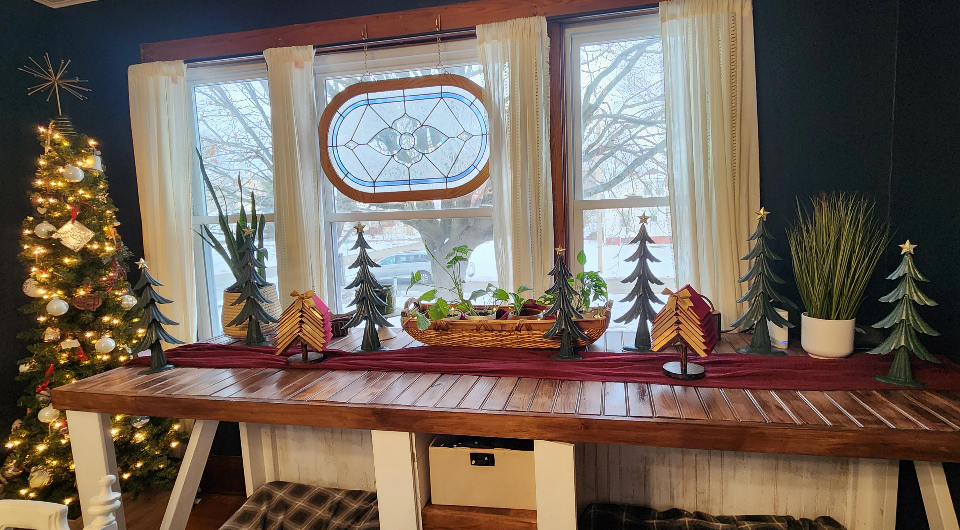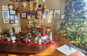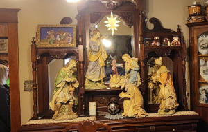 Christmas scenes. A large ceramic Nativity set in the dining room
