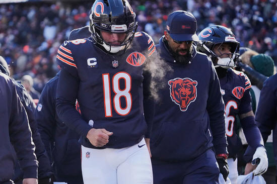 Chicago Bears quarterback Caleb Williams walks off the field at