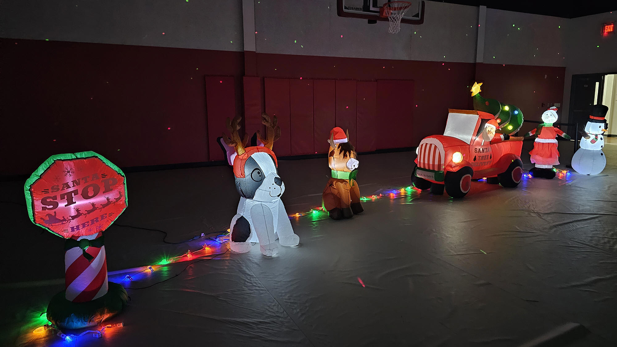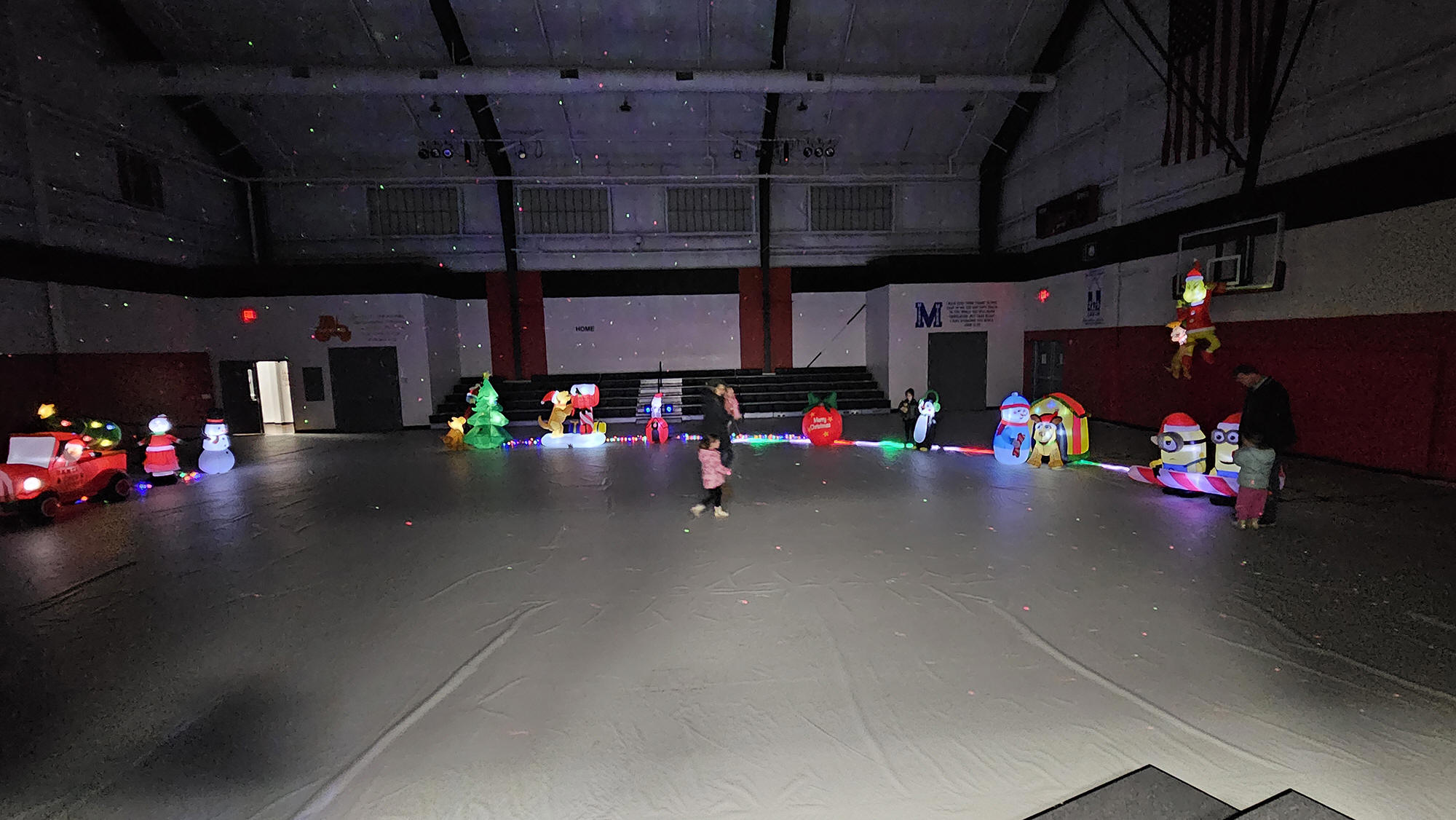 an indoor inflatable village set up inside the gymnasium.