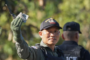 A member of a Thai Explosive Ordnance Disposal team shows pieces of