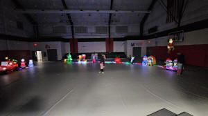 an indoor inflatable village set up inside the gymnasium.