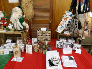 In addition to the baked goods was an area where one could buy decorative items. There were Christmas/animal themed tea towels. There was also a wooden advent calendar for animals. Various reusable bags were for sale, and many other Christmas themed items.