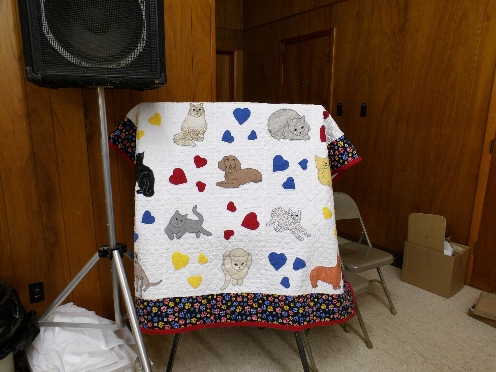 There was also a raffle for a quilt next to the checkout area. The quilt had several cats and dogs on it, with some hearts and a decorative border around the outside.
