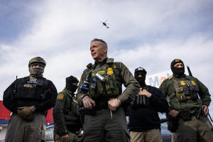 U.S. Border Patrol Cmdr. Gregory Bovino, center, looks on after