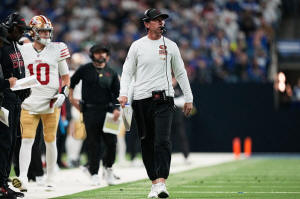 San Francisco 49ers head coach Kyle Shanahan walks near the sideline