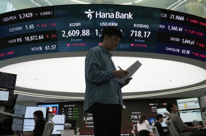 A currency trader works near a screen showing the Korea Composite