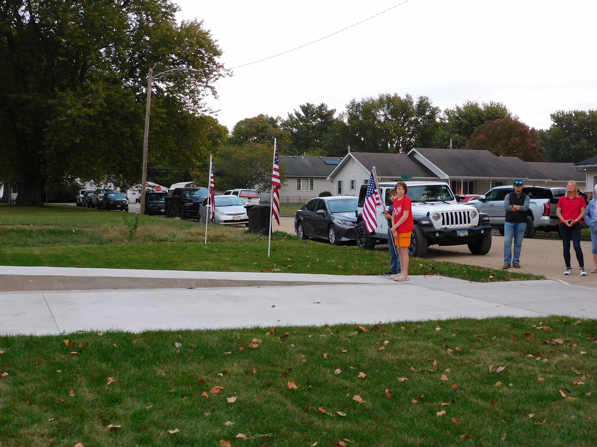 At 6 p.m. the dedication program began with the scouts participating in the placement of American Flags on the board of each home. Scout Raylon Schreiner led the commands for the youth to salute and present the colors. Two scouts moved forward, walking the length of the front walk to the porch, and placing the flags in the mounts on the front posts of the porches. Schreiner then sang the National Anthem.