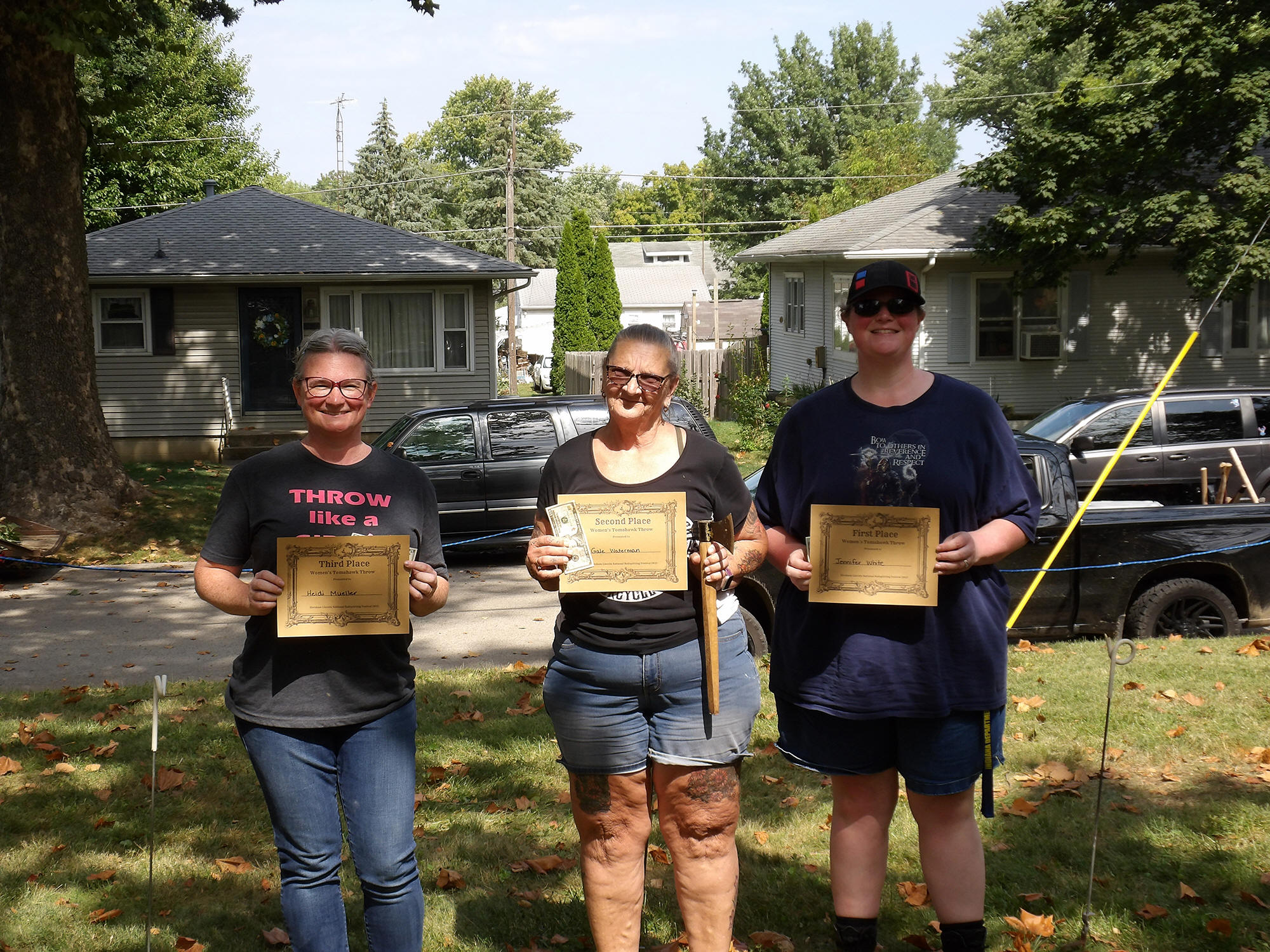 tomahawk at a round chunk of wood propped up by some wooden legs.