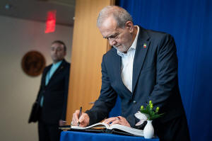 Masoud Pezeshkian, the President of Iran, signs a note in a United