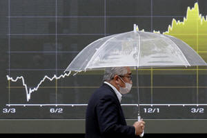A person walks in front of an electronic stock board showing Japan's Nikkei index chart at a securities firm Monday, March 23, 2026, in Tokyo. (AP Photo/Eugene Hoshiko)