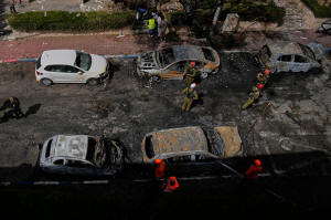 Israeli security forces and rescue teams inspect a site struck by an