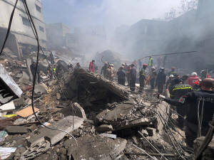 Rescue workers search for victims at the site of an Israeli