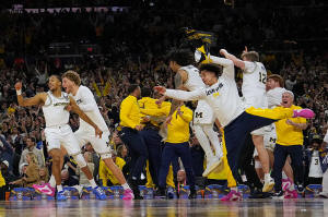 Members of Michigan celebrate after defeating UConn in the NCAA