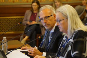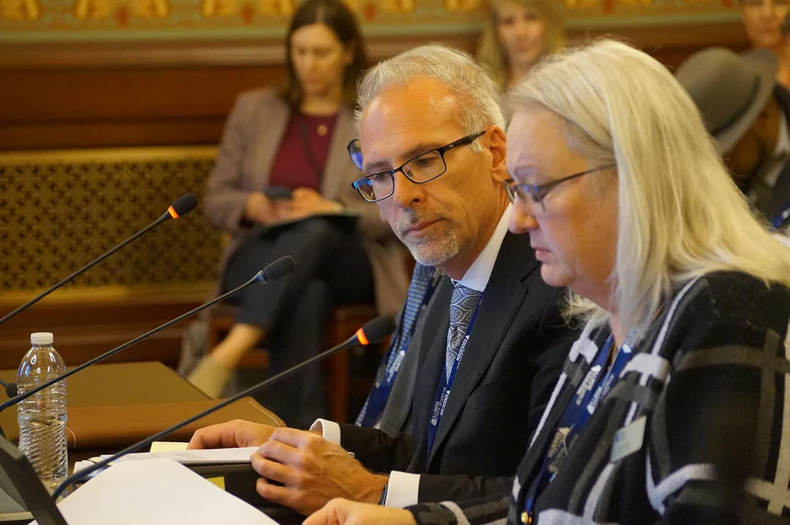 Illinois State Superintendent of Education Tony Sanders, left, and State Board of Education member Patricia Nugent, present the agency’s $10.9 billion budget request to a House appropriations committee Tuesday, April 7. (Capitol News Illinois photo by Peter Hancock)