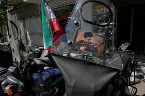 A poster is pasted on a motorbike windshield with graphic depicting Iran's Supreme Leader Ayatollah Mojtaba Khamenei as government supporters gather to mark the 40th day since the killing of his father, Supreme Leader Ayatollah Ali Khamenei, in Tehran, Iran, Thursday, April 9, 2026. (AP Photo/Vahid Salemi)