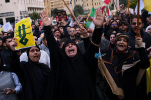 Hezbollah supporters shout slogans during a protest against the