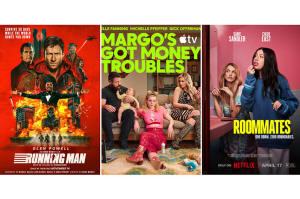 This combination of images show promotional art for the film "The Running Man," lwdt, the series "Margo's Got Money Troubles," center, and the film "Roommates." (Paramount/Apple TV/Netflix via AP)