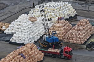 Workers transfer bags of imported solid sulfur onto a truck in a
