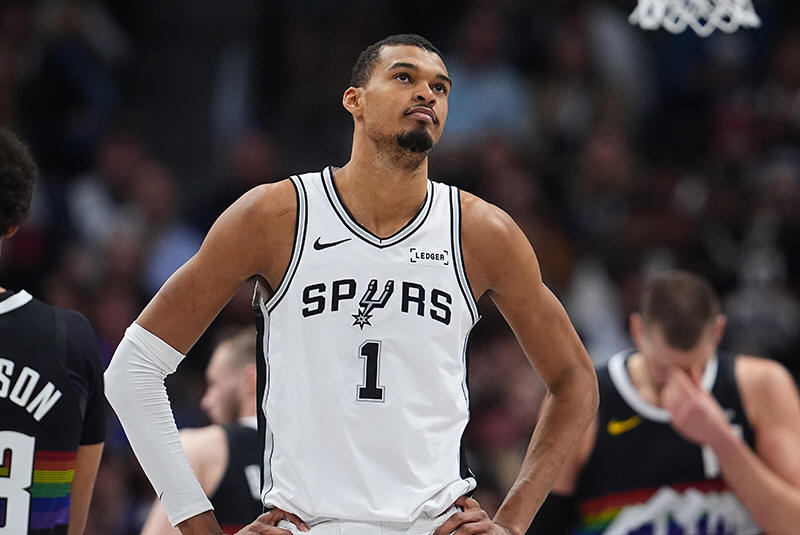 San Antonio Spurs center Victor Wembanyama reacts after being called