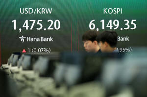 Dealers talk near the screen showing the Korea Composite Stock Price Index (KOSPI), right, and the foreign exchange rate between U.S. dollar and South Korean won at a dealing room of Hana Bank, in Seoul, South Korea, Thursday, April 16, 2026. (AP Photo/Lee Jin-man)