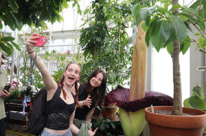 Students take a selfie with the blooming corpse flower known as "Pangy"