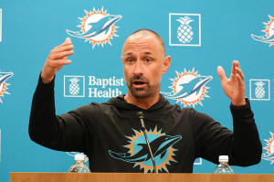 Miami Dolphins general manager Jon-Eric Sullivan gestures during a