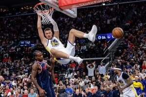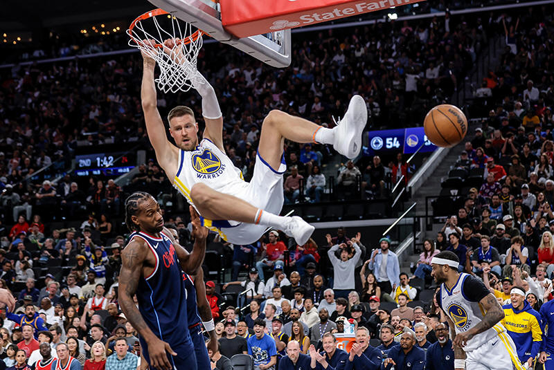 Golden State Warriors' Krystaps Porzingis (7) hangs from the rim