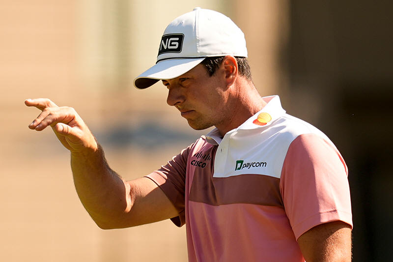 Viktor Hovland, of Norway, lines up a putt on the second green