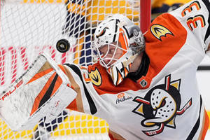 Anaheim Ducks goaltender Ville Husso (33) watches a goal is scored