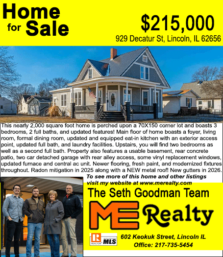 All real estate advertised in the Lincoln Daily News is subject to the Fair Housing Act for 1968 which makes it illegal to advertised "any preference, limitation, or discrimination based on race, color, religion, sex or national origin, or intention to make special preference, limitations, or discrimination."