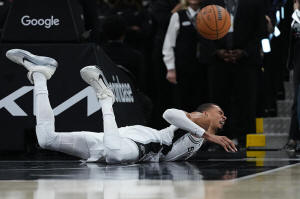 San Antonio Spurs forward Victor Wembanyama (1) takes a hard fall on