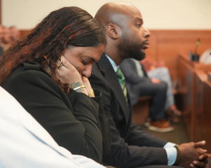 The mother of Casey Goodson Jr., Tamala Payne, covers her ears during opening statements in the retrial offormer Franklin County Deputy Jason Meade, who is charged with murder and reckless homicide in the 2020 killing of Goodson Jr., inside Franklin County Common Pleas Court in Columbus, Ohio, Thursday, April 23, 2026. (Doral Chenoweth/Pool Photo via AP)