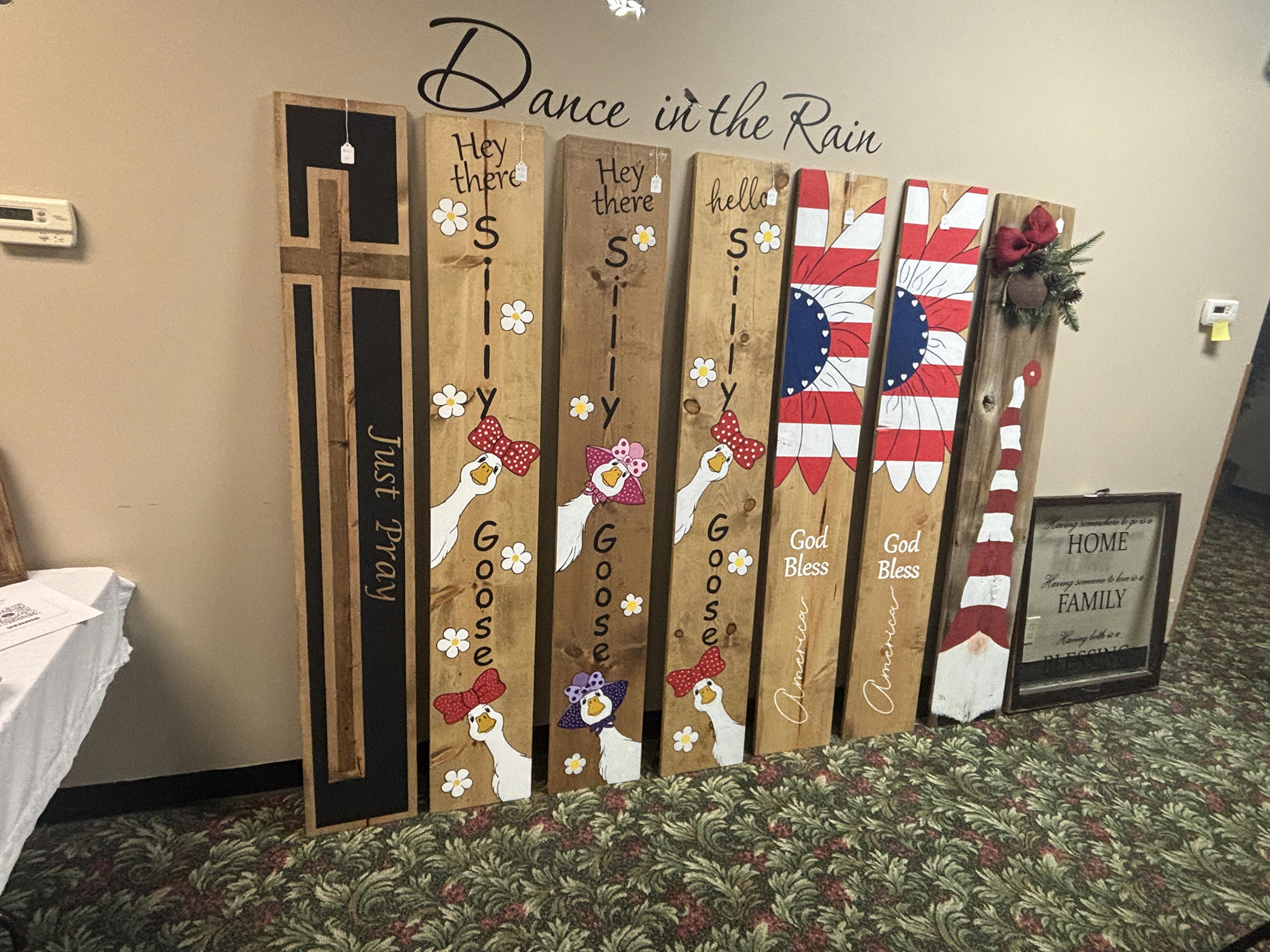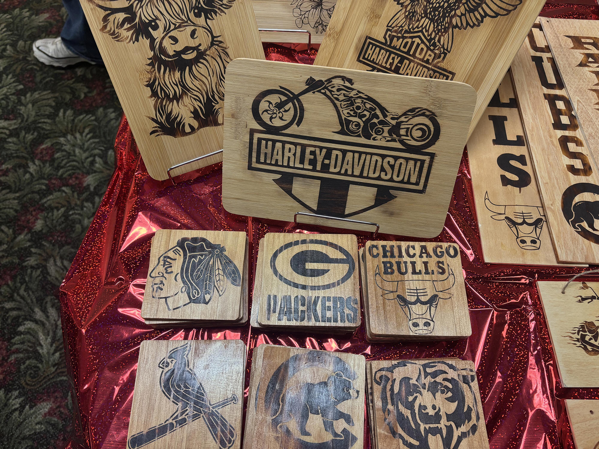 team spirit, Spring’s Creations had a selection of burnt-wood signs,