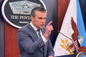 Defense Secretary Pete Hegseth speaks to members of the media during a