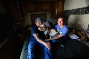 Michael Gibson and his fiancée Tabitha Enke sit inside their camper