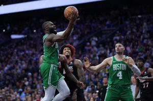 Boston Celtics' Jaylen Brown, left, goes up for a shot past