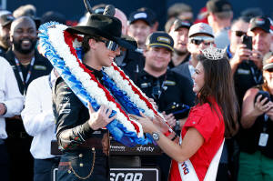 Carson Hocevar is presented a wreath from Miss Alabama Hailey Adams