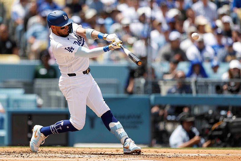 Los Angeles Dodgers' Miguel Rojas hits a two-run double, scoring