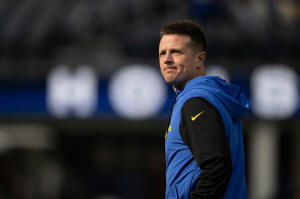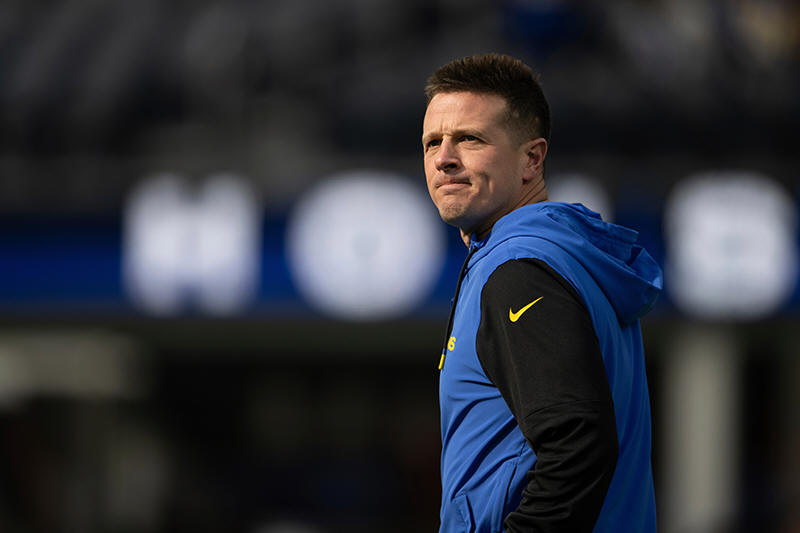 Los Angeles Rams offensive coordinator Mike LaFleur walks on