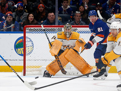 goalie Juuse Saros, left, guards the net as New York Islanders
