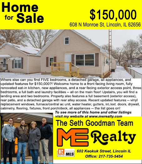 All real estate advertised in the Lincoln Daily News is subject to the Fair Housing Act for 1968 which makes it illegal to advertised "any preference, limitation, or discrimination based on race, color, religion, sex or national origin, or intention to make special preference, limitations, or discrimination."