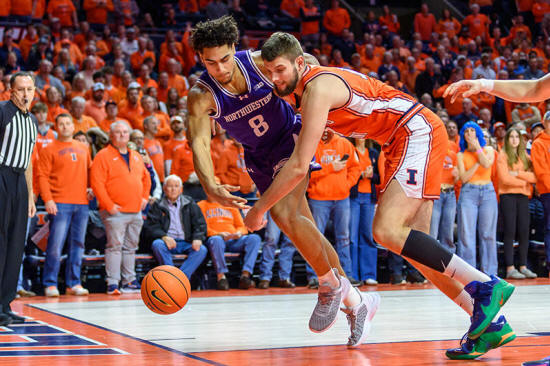 Illinois' Tomislav Ivisic and Northwestern's Tre Singleton reach