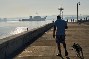A man walks his dog along Havana Bay where the Mexican Navy ship