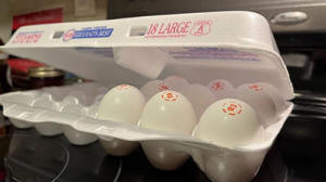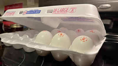 A carton of large eggs rests on a kitchen stove. Photo: Alan Wooten