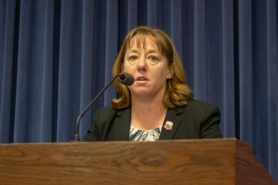Rep. Amy Elik, R-Godfrey, speaks at a news conference at the