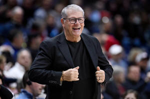 UConn head coach Geno Auriemma smiles in the first half of an NCAA