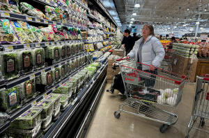 Shoppers shop at a grocery store in Schaumburg, Ill., Monday, Feb.