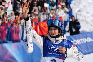 Gold medalist China's Eileen Gu celebrates winning the women's