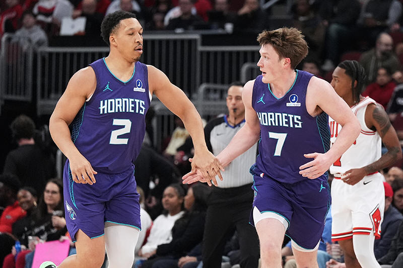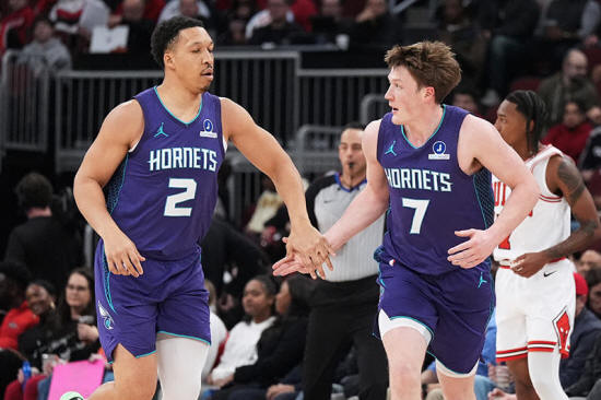 Charlotte Hornets guard Kon Knueppel, right, celebrates with