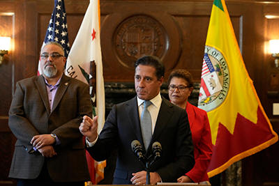 District Superintendent Alberto Carvalho, at podium, holds a news